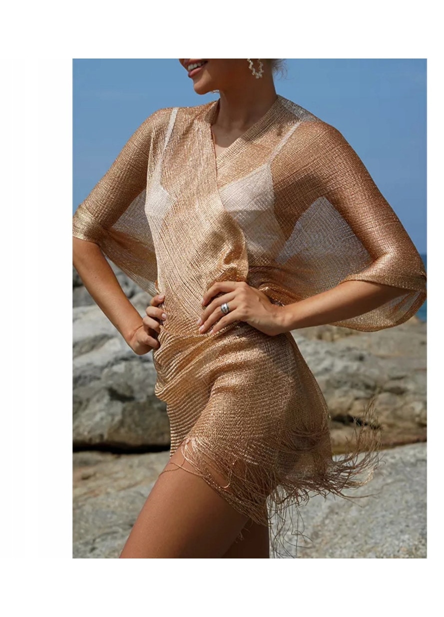 Tunica plaja, SNM, stil boho, material aerat stralucitor, croi kimono lejer, franjuri decorative, marime universala, protectie eleganta