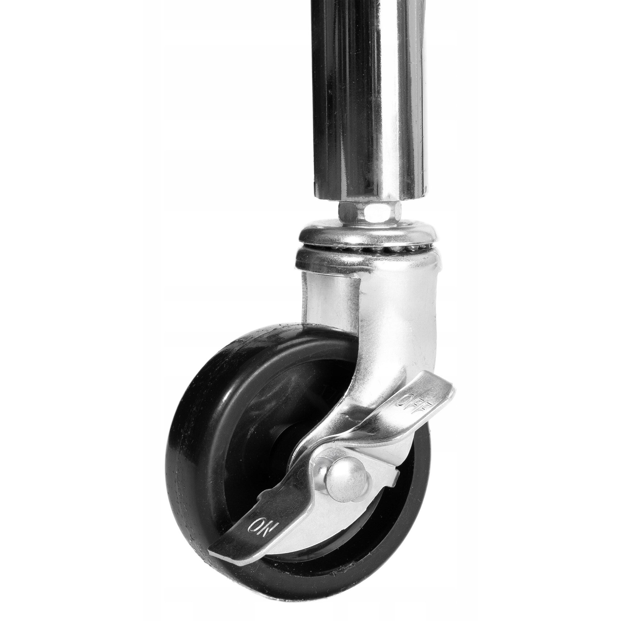 Umerătorul este echipat cu patru roți solide, ceea ce facilitează semnificativ deplasarea sa. Două dintre aceste roți sunt echipate cu frâne, ceea ce asigură siguranță și stabilitate suplimentară atunci când umerătorul stă în locul ales. Aceste roți sunt proiectate pentru a fi durabile și ușor de manevrat, chiar și sub greutatea hainelor agățate în întregime. Frânele funcționează intuitiv și sunt simple de utilizat – este suficient să apăsați sau să ridicați o mică manetă situată pe roată pentru a bloca sau debloca umerătorul.