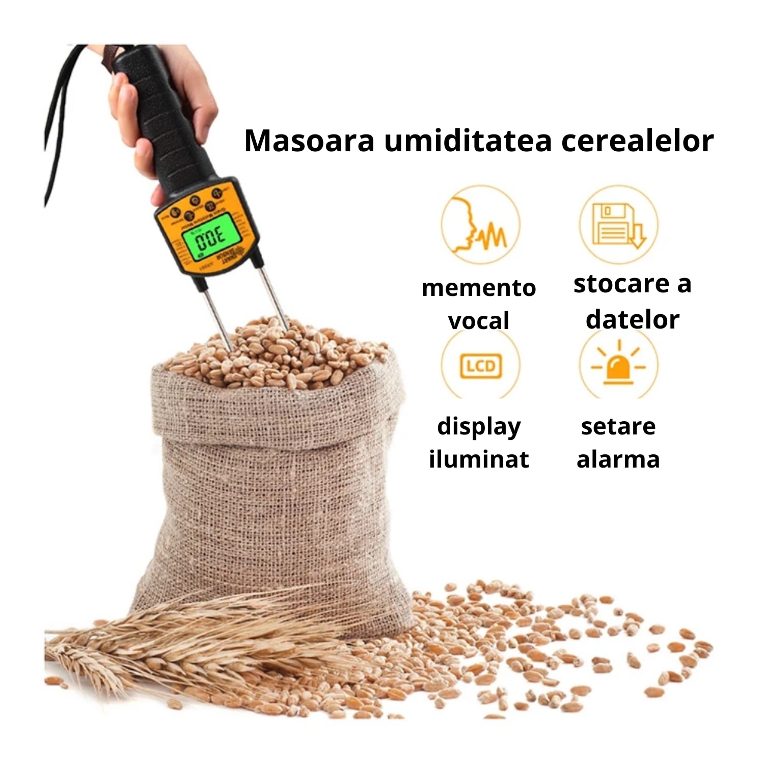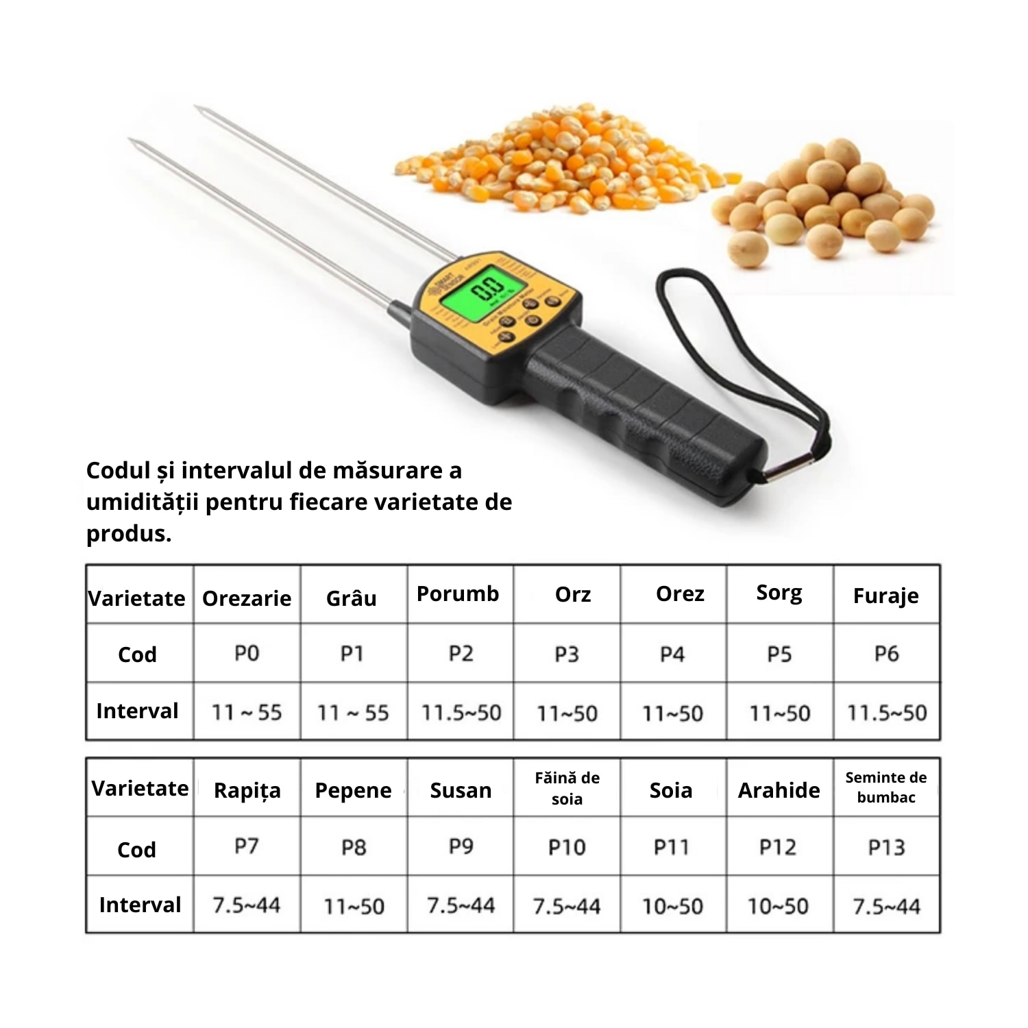 Umidometru, aparat profesional pentru detectarea gradului de umiditate a cerealelor, baloti, seminte, alune, orez, cafea, peleti, brichete, rumegus