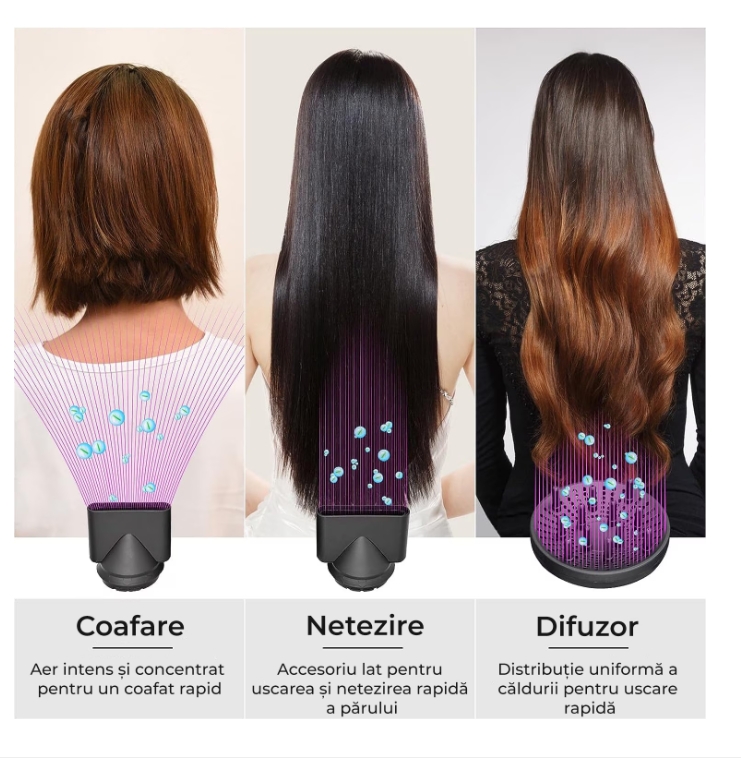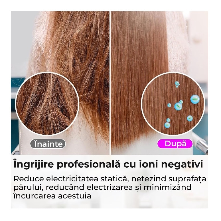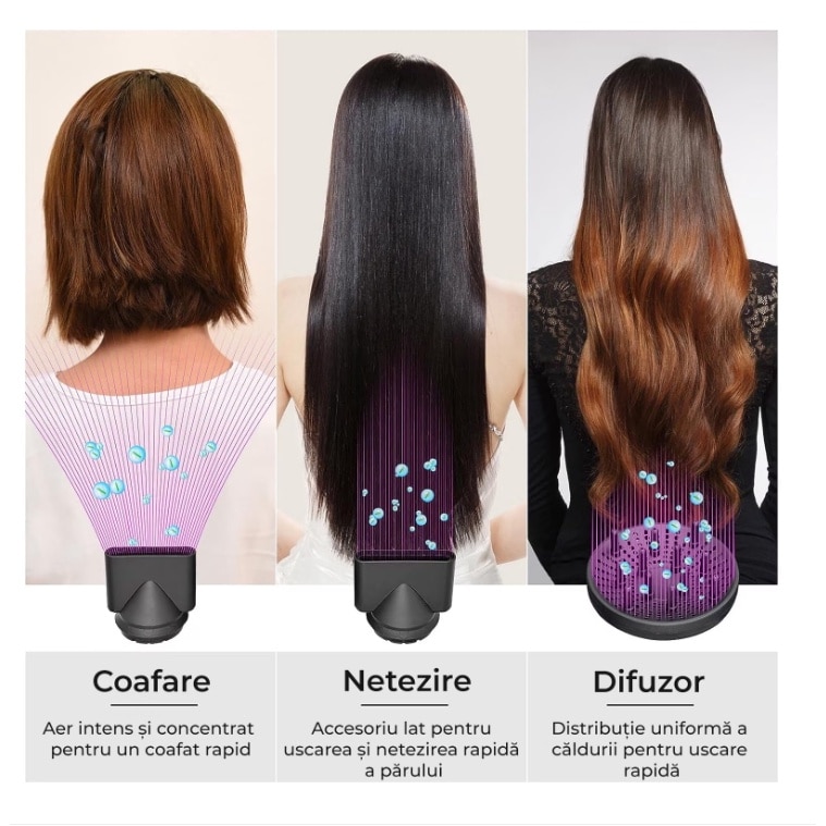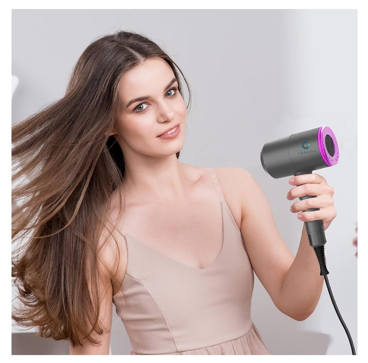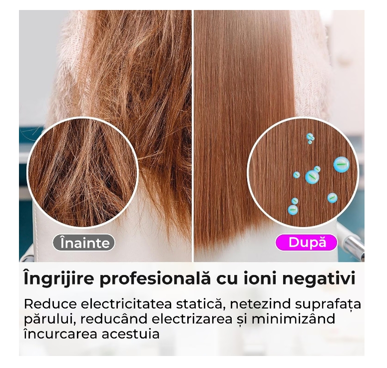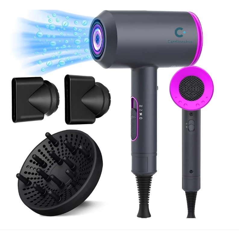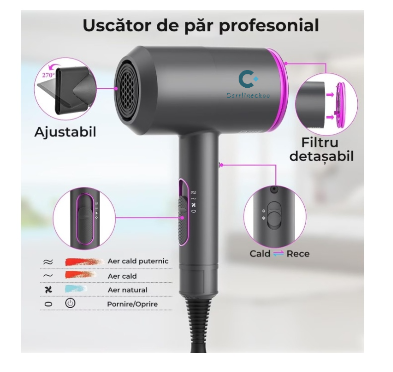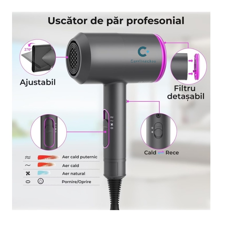 Uscator de par profesional ionic, uscarea rapida ca la salon, nucleu ceramic, ioni negativi, cu 2 viteze si 3 trepte de temperatura, Putere 2000W, Set 3 Accesorii, Gri Roz, carrlinechoo
