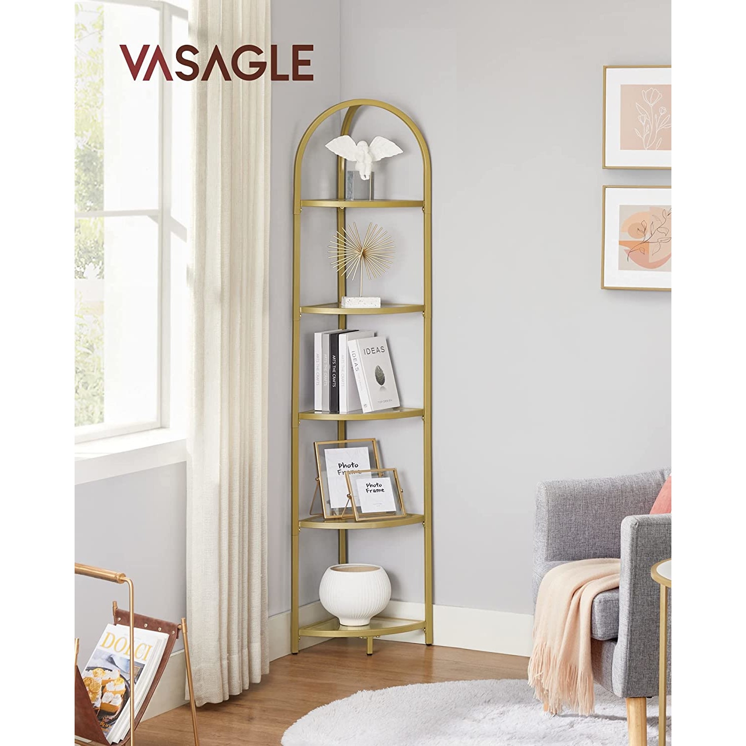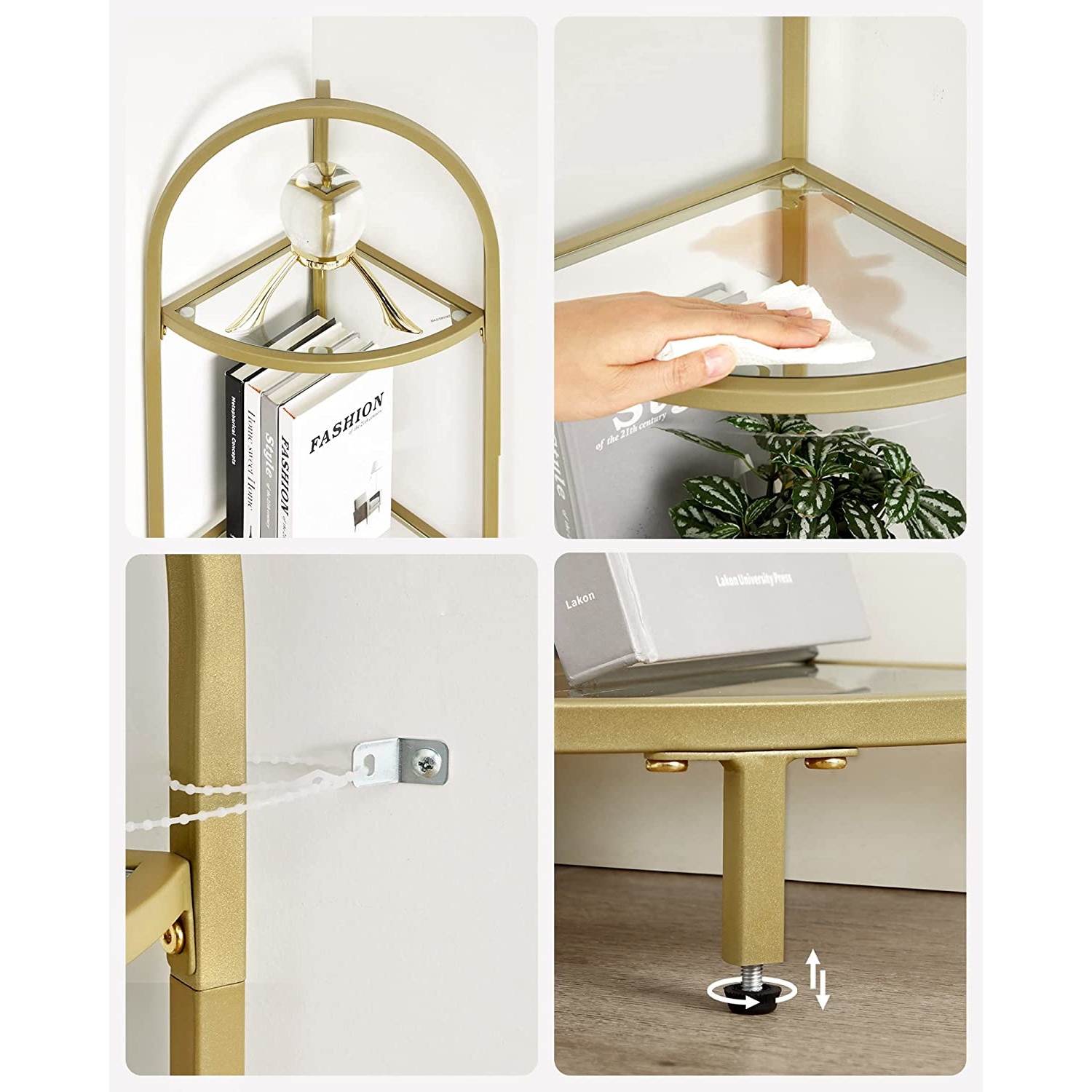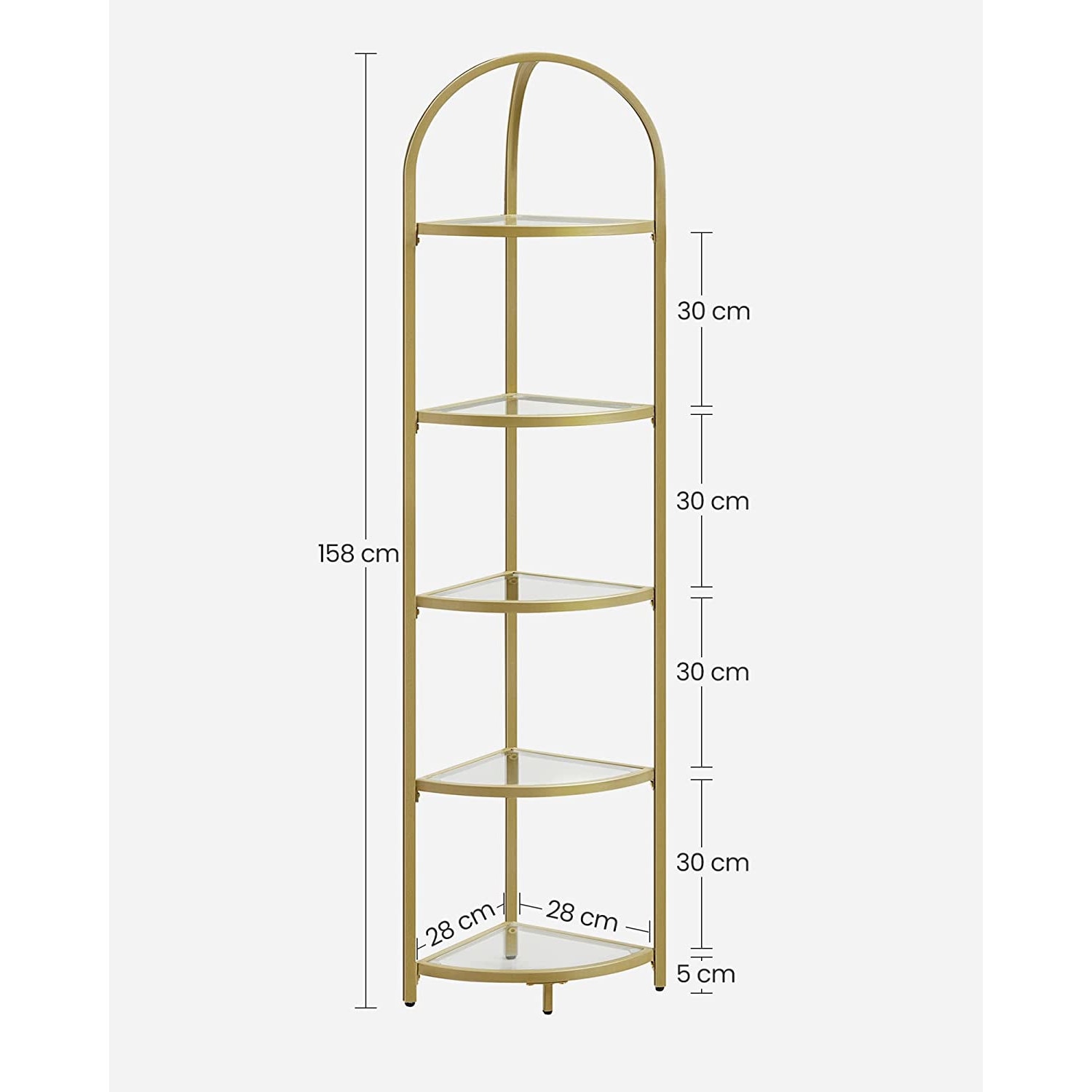 VASAGLE Raft de colt cu trepte pentru dormior, 5 etaje, din sticla securizata, cadru din otel, 28x28x158cm, auriu+