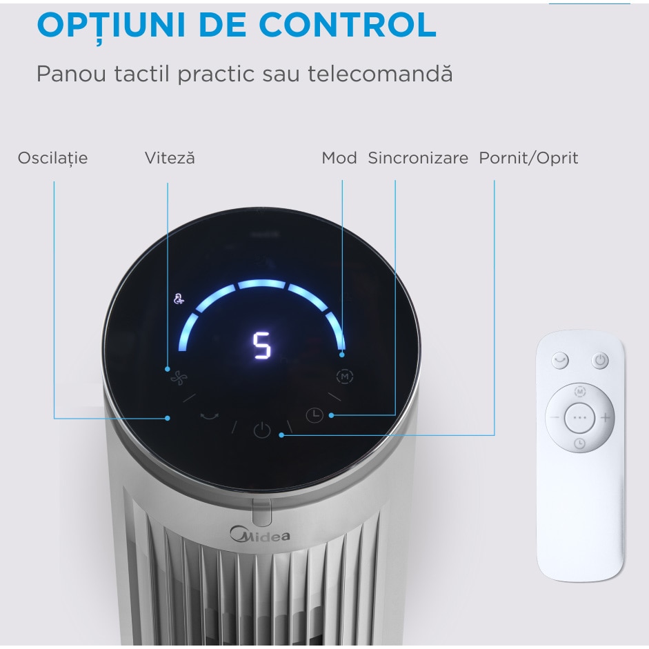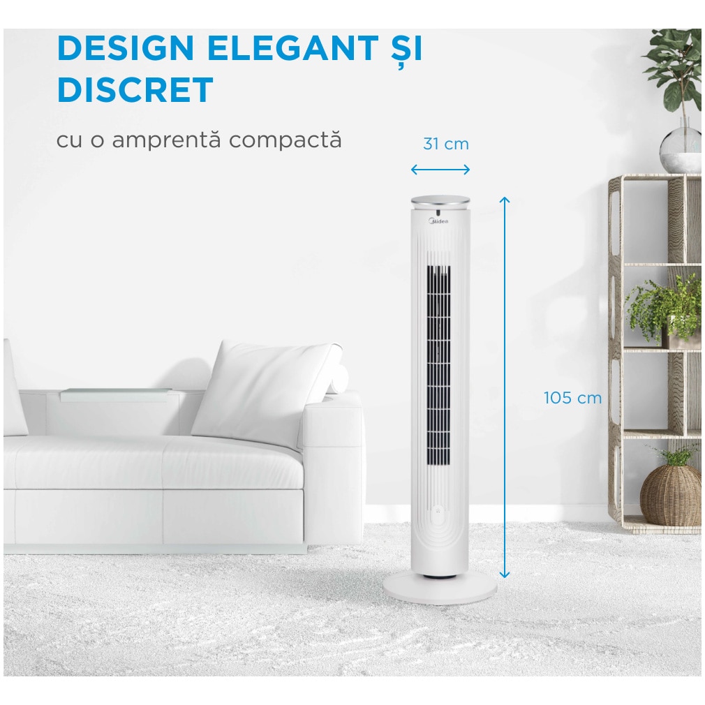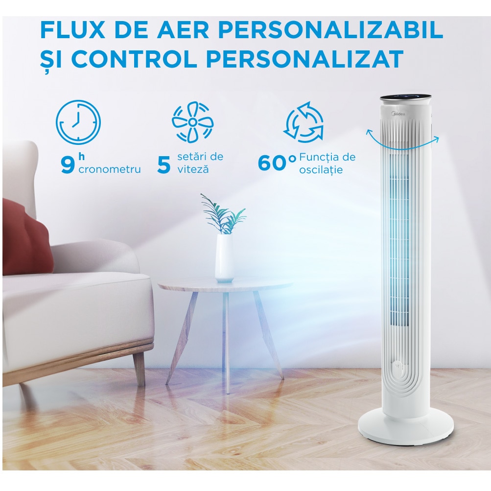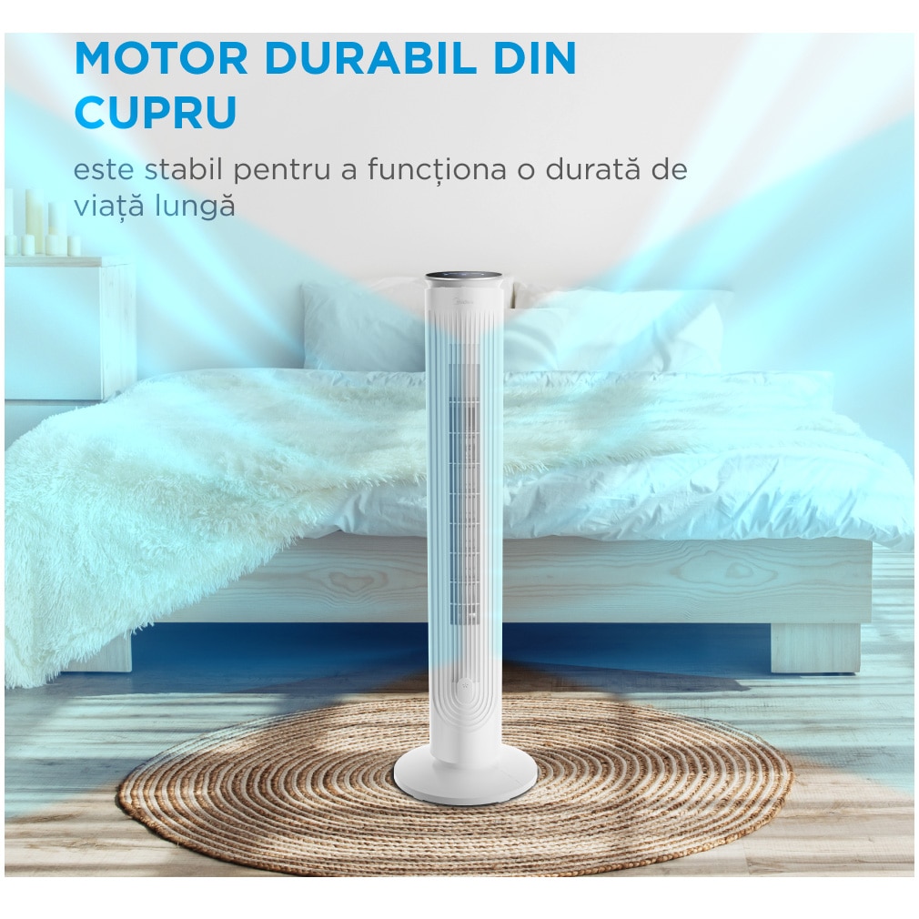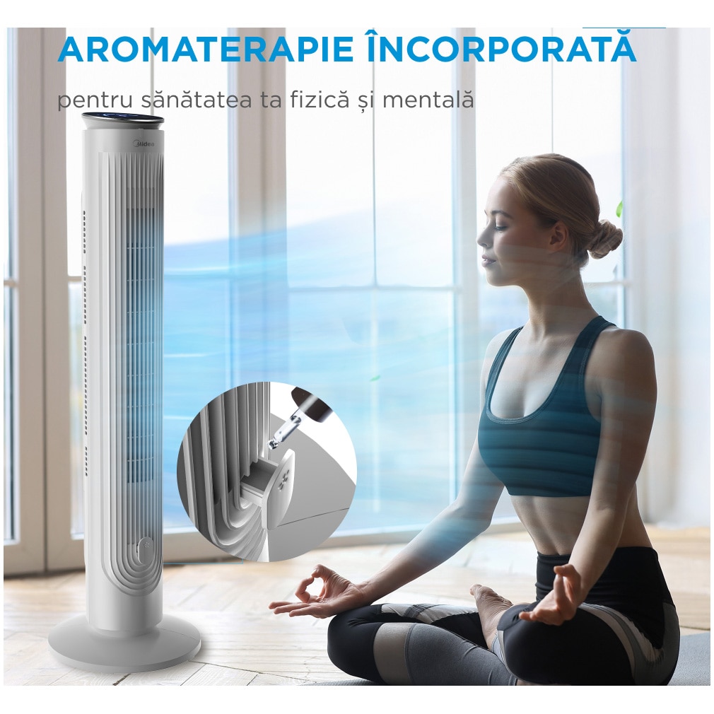 Ventilator turn Midea FZ10-21ARBW, Aromaterapie incorporata, 3 moduri, Control cu panou tactil, Temporizator, 40 W, Telecomanda, Alb