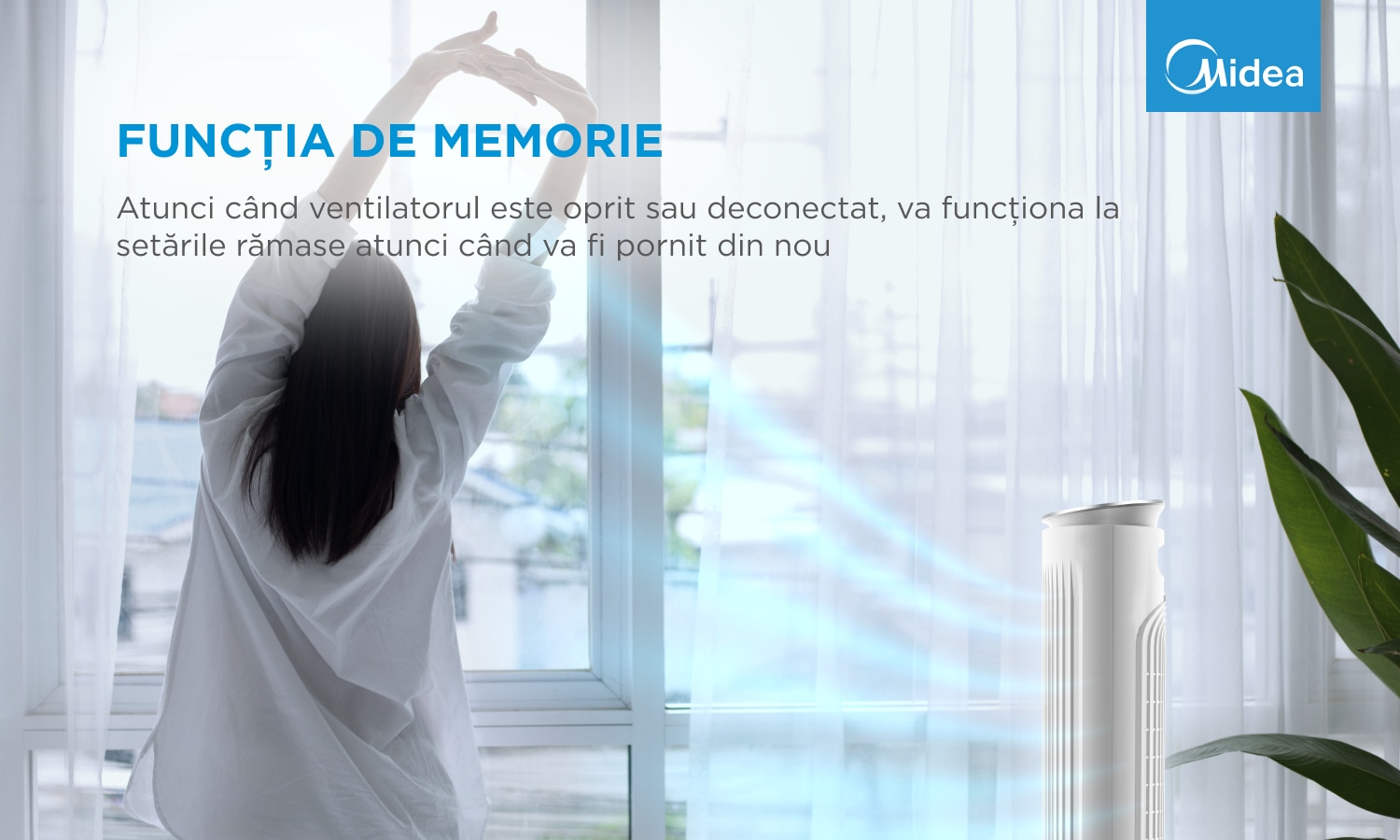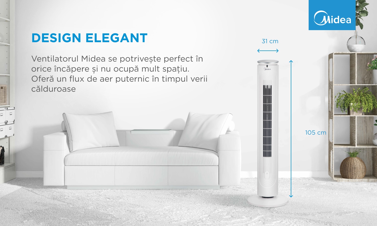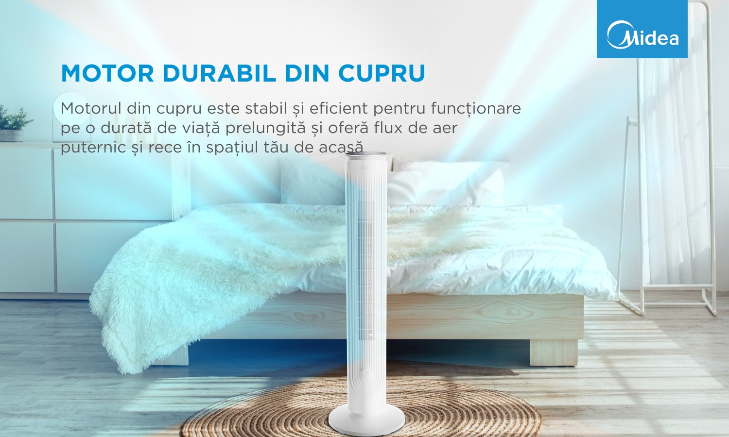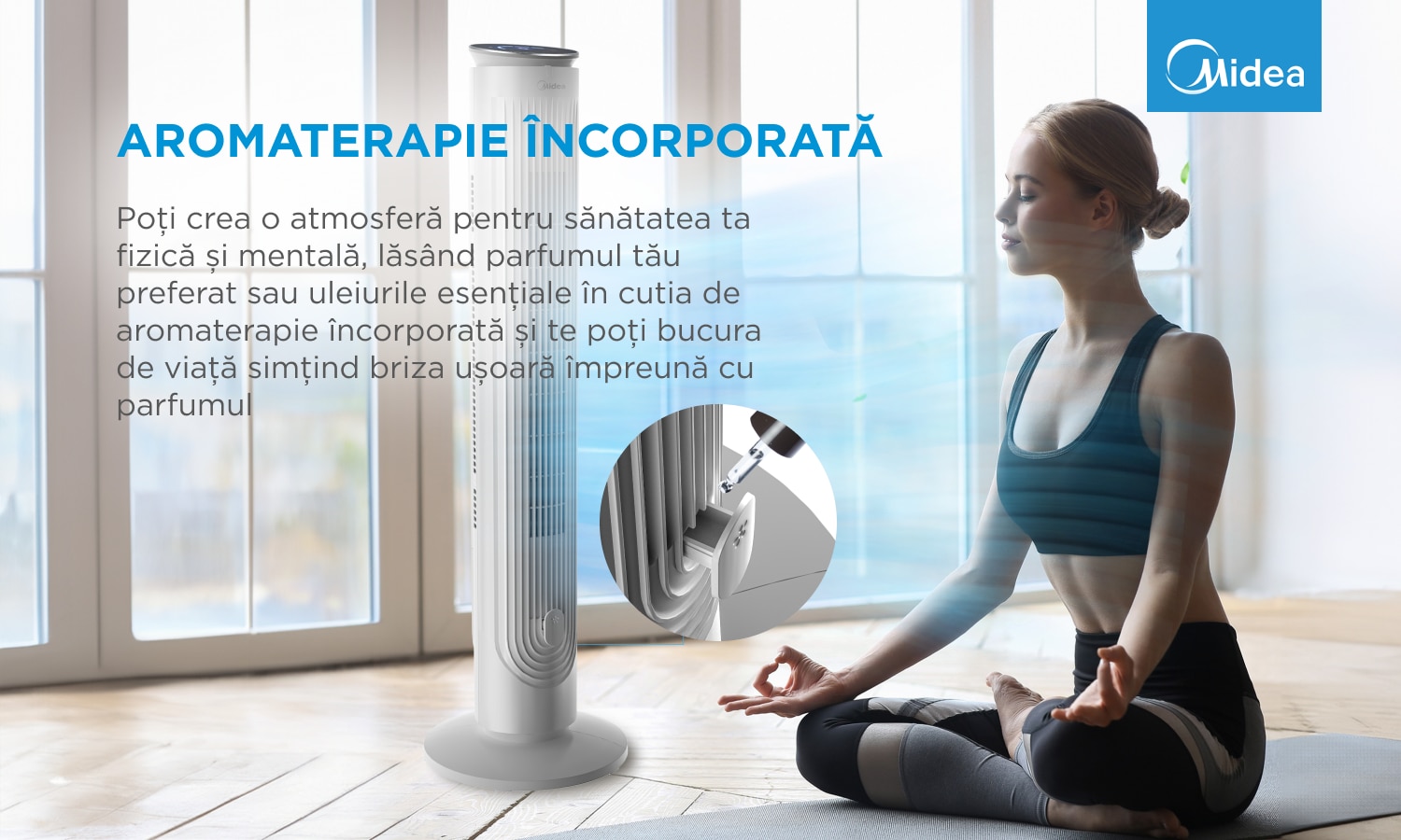 Ventilator turn Midea FZ10-21ARBW, Aromaterapie incorporata, 3 moduri, Control cu panou tactil, Temporizator, 40 W, Telecomanda, Alb