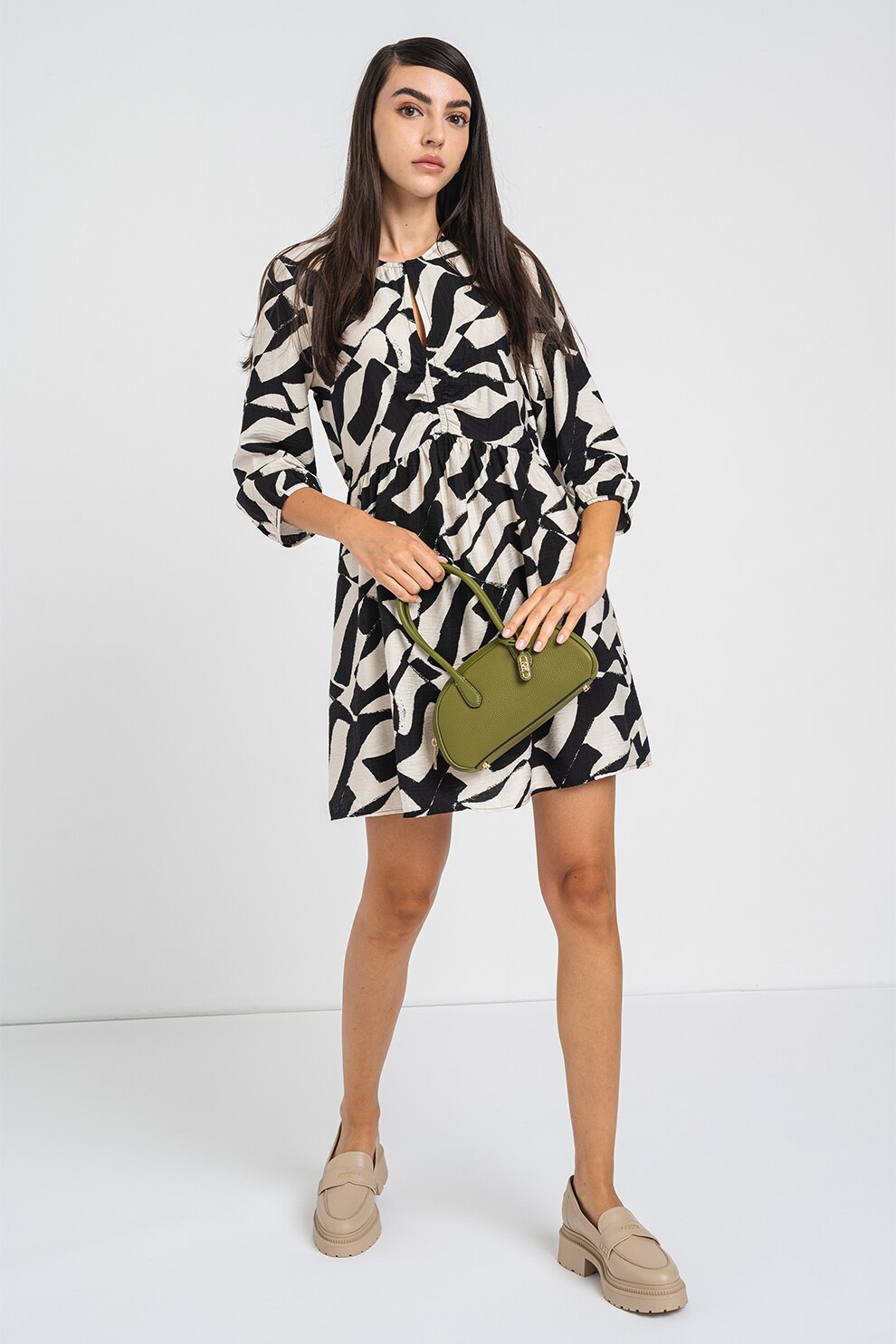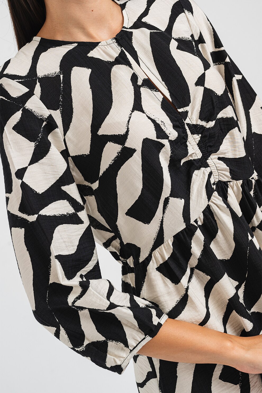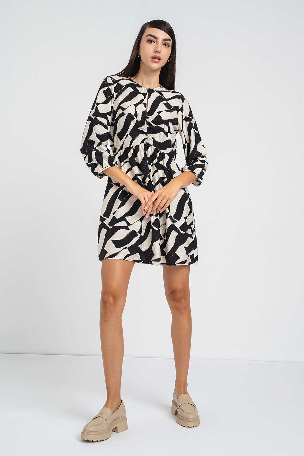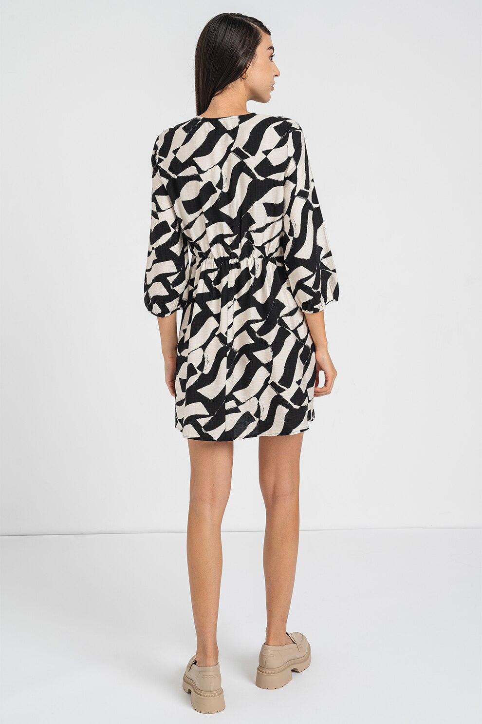 Vero Moda - Rochie evazata cu maneci trei sferturi Joss, Negru, Alb murdar, XS