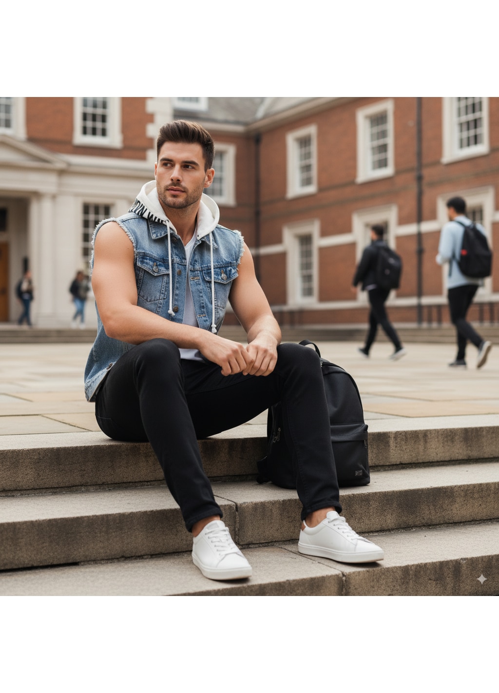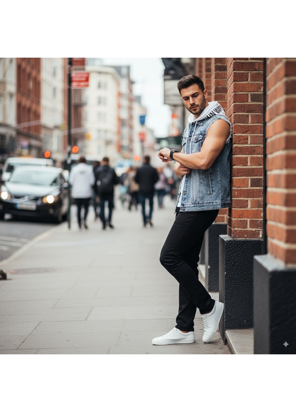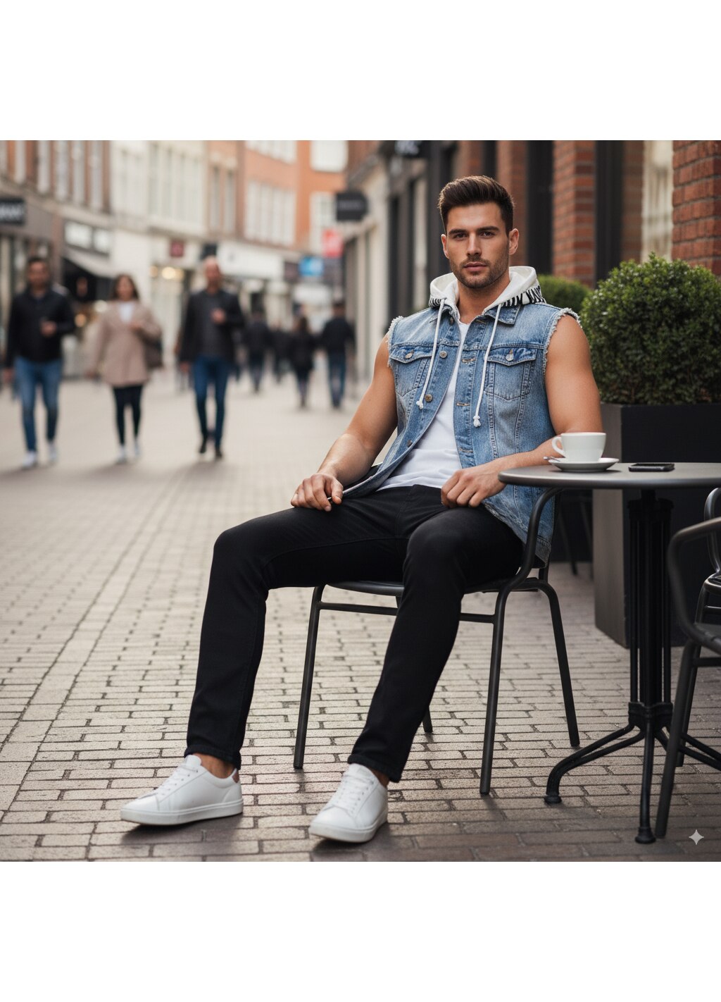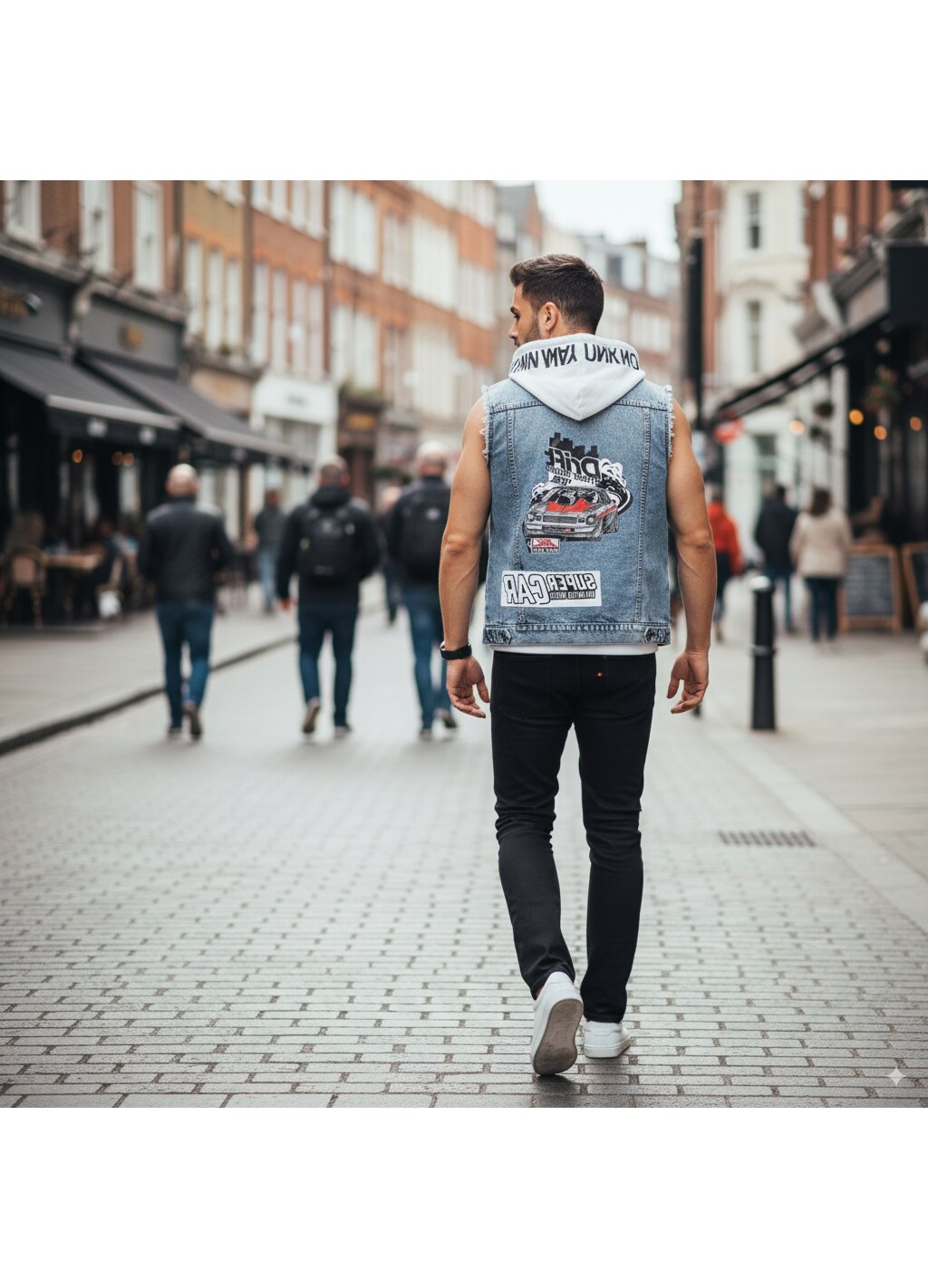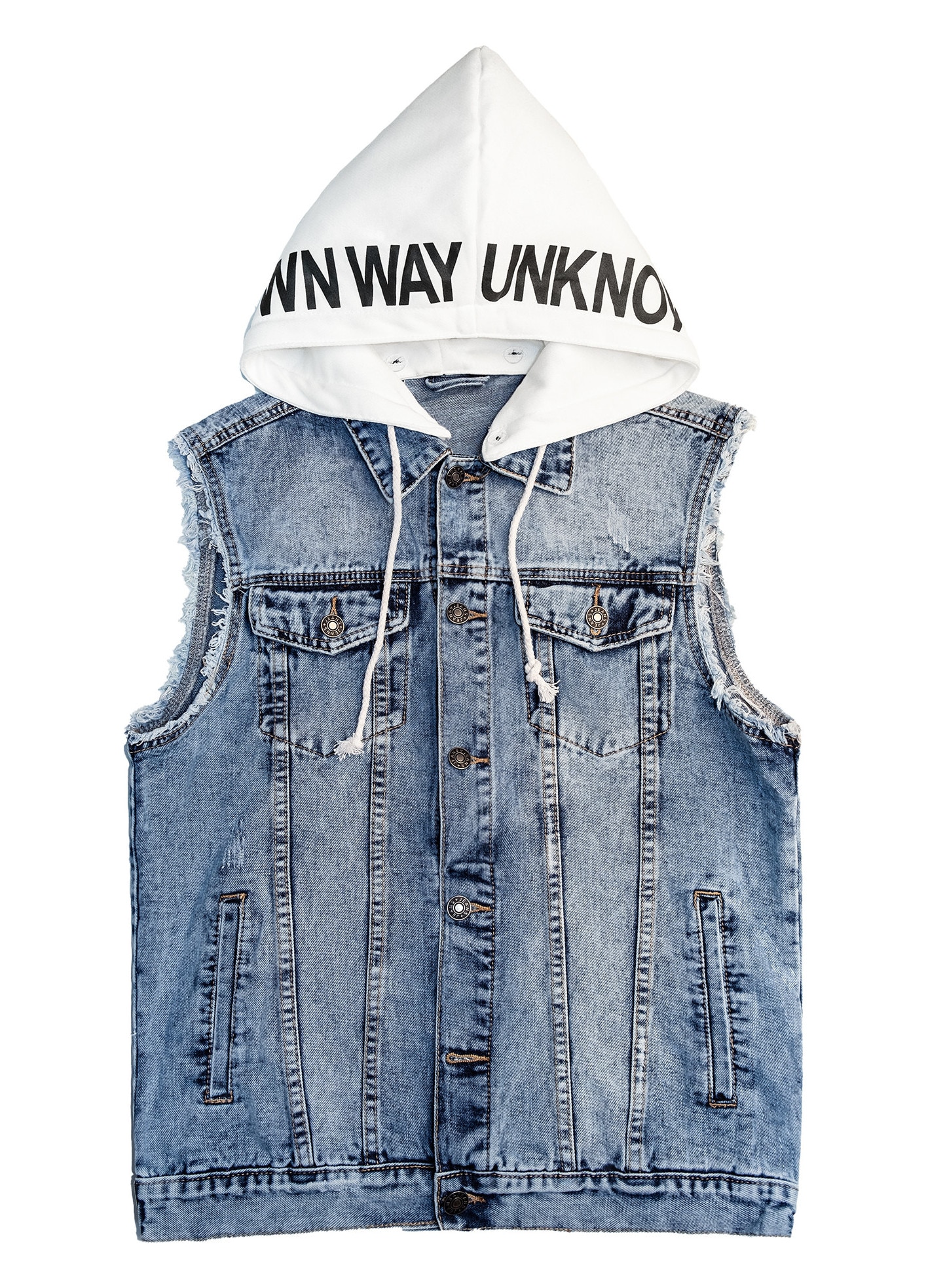 Vesta de blugi fara maneci pentru barbati Realize, cu gluga alba imprimata si margini taiate, albastru deschis, XL
