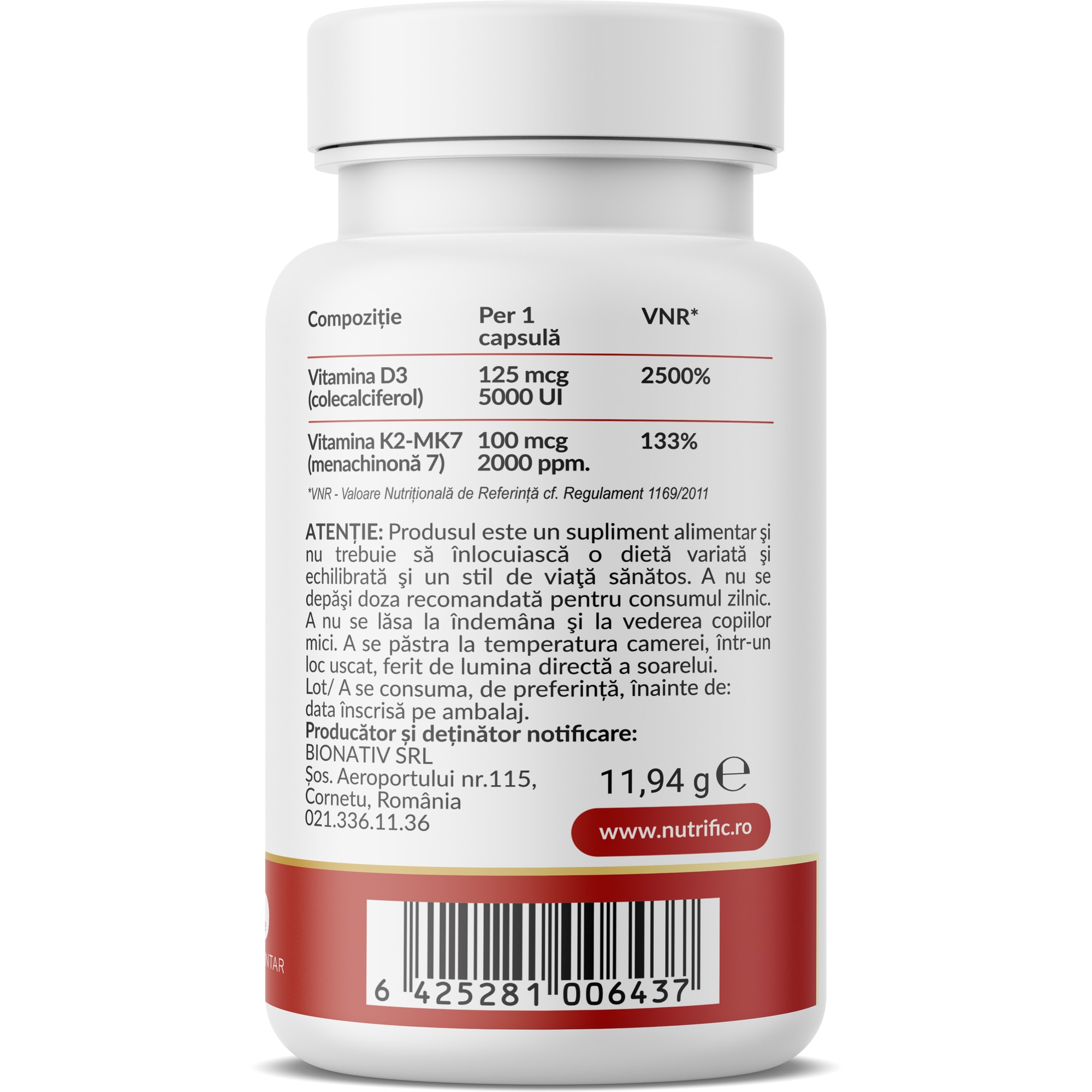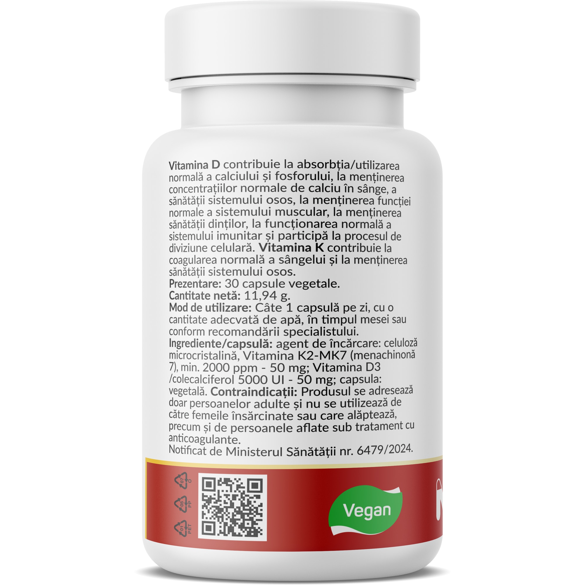 Ingrediente/capsula: agent de incarcare: celuloza microcristalina, Vitamina K2-MK7 (menachinona 7), min. 2000 ppm - 50 mg; Vitamina D3/colecalciferol 5000 UI - 50 mg; capsula: vegetala.