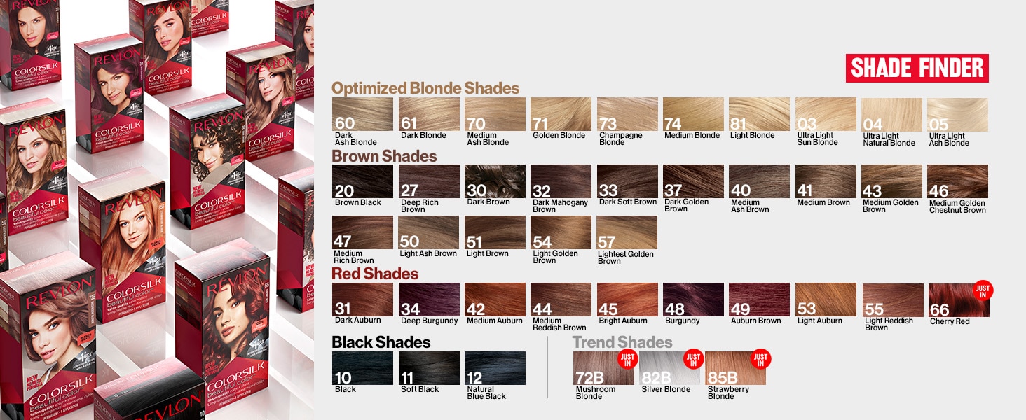 Revlon Colorsilk prezinta o paleta de 41 de nuante cu aspect natural de la negru, saten, blond, roscat si nuante platinate dintre care o poti alege pe cea preferata.