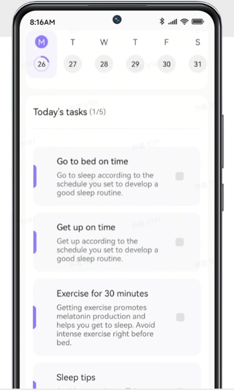 Pe baza datelor de somn anterioare, Smart Band ofera un plan de 21 de zile pentru a-ti optimiza somnul si te ajuta sa iti stabilesti o rutina de somn constanta pentru o sanatate si odihna mai buna.